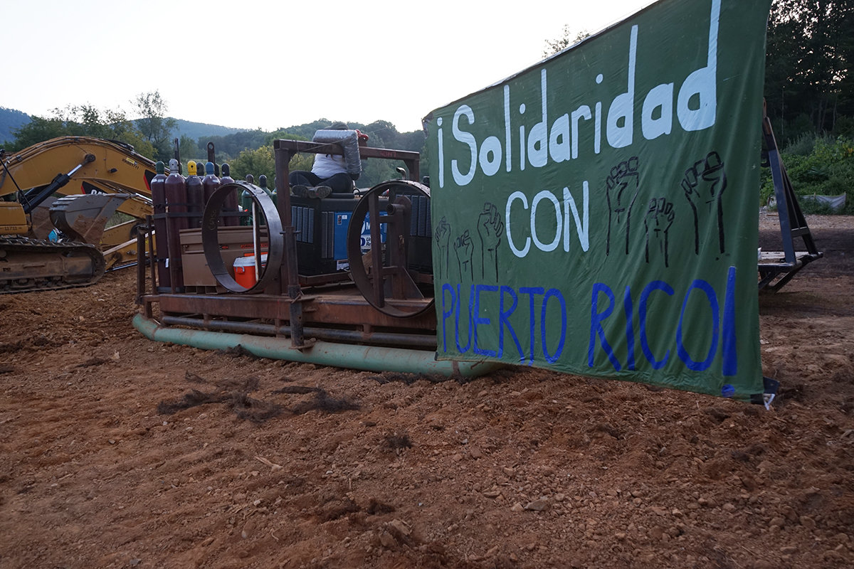 Clove, la otra persona encerrada en un trineo de soldadura, declaró lo siguiente en referencia a una de las pancartas en el sitio: “un indicador de la desestabilización climática es la creciente gravedad de los huracanes. En 2017, el huracán María devastó la isla de Puerto Rico y otros lugares circundantes. Desde ese huracán, hemos visto comunidades que se cuidan entre sí de una manera que el gobierno no lo hará, y ahora más que nunca estamos viendo a personas tomar ese poder y usarlo para rechazar al gobierno por completo. Queremos mostrar amor y apoyo a las personas en Puerto Rico que luchan por la autonomía en sus vidas después de un desastre, en un planeta que sólo tendrá más desastres en el futuro cercano”.